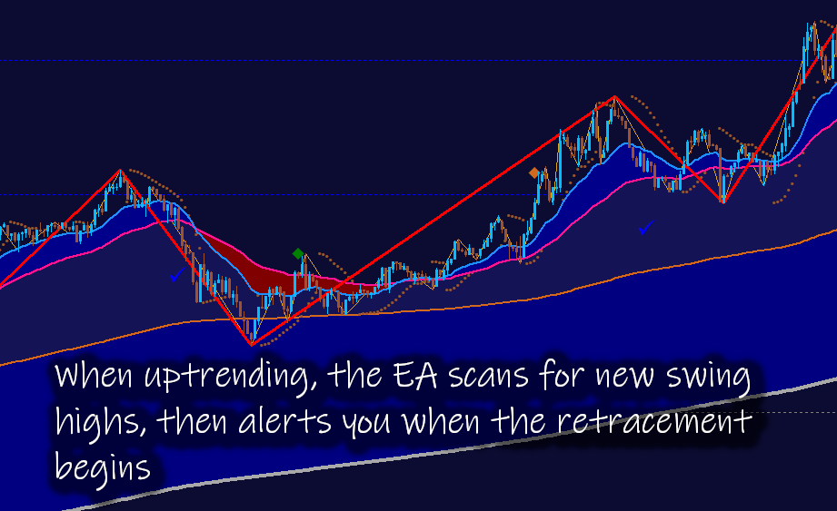 The EA continuously monitors market structure to determine the prevailing trend. In an uptrend, it tracks new swing highs and alerts you when a retracement begins—keeping you aligned with the momentum.